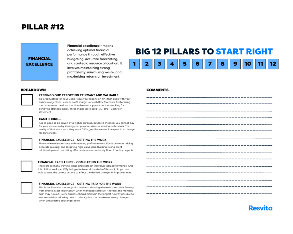 very tradie wants to grow a business that’s profitable, reliable, and sustainable. Yet the truth is, many skilled tradespeople struggle to keep their finances under control. That’s why financial excellence for tradies is at the heart of Pillar 12 of the ResVita 12 Big Pillars. It’s about knowing your numbers, protecting your cashflow, and making confident decisions that secure your future.